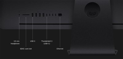 There are four Thunderbolt 3 USB-C ports on the back of the iMac Pro, 4 USB-A 3.0 ports, a 10Gb Ethernet port, a 3.5mm audio jack, and a slot for the SD card